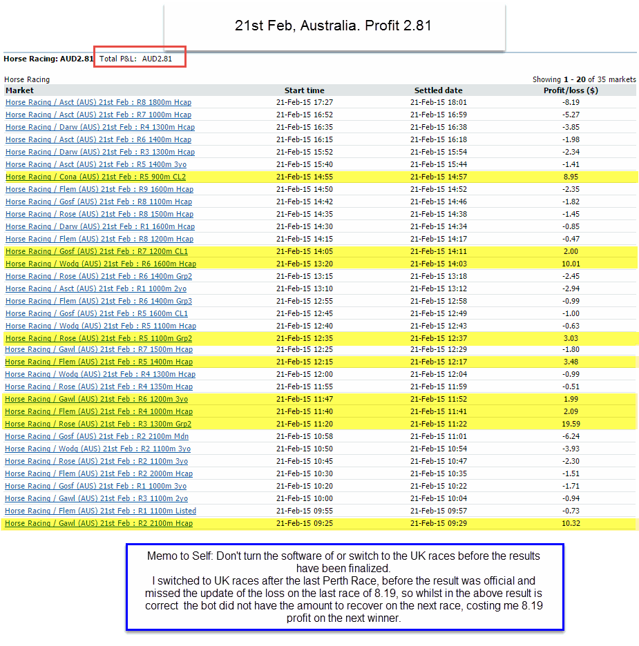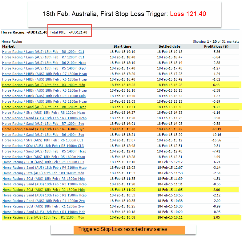 A word of warning, some countries have slow advice of results and this can mean missing some following races, as the results must be known before the next bet is place in that that tab. So if you have a race and it was a back bet, the the next back bet will not be placed until the result is confirmed, it would not stop the next race bet if it was a lay bet, and vice versa.